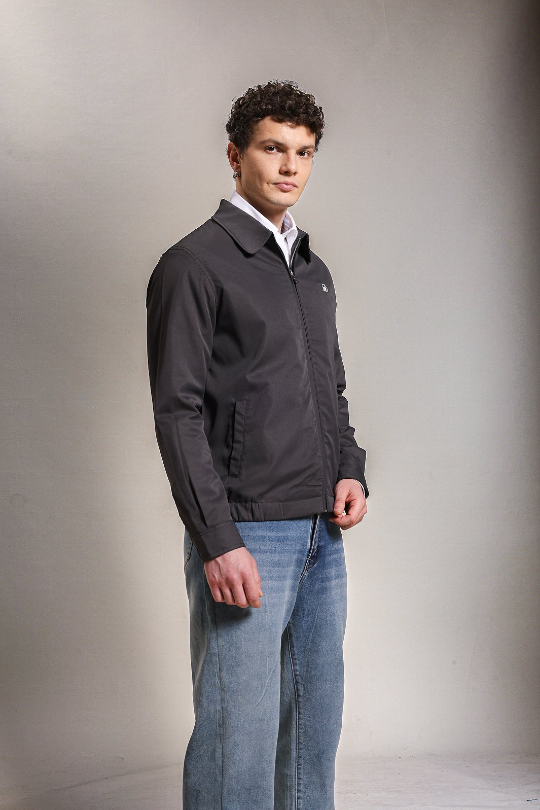 Cotton Twill Spread Collar Night Grey Jacket With Embroidery