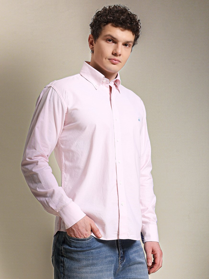 Pink summer shirt with a contrast blue striped collar.