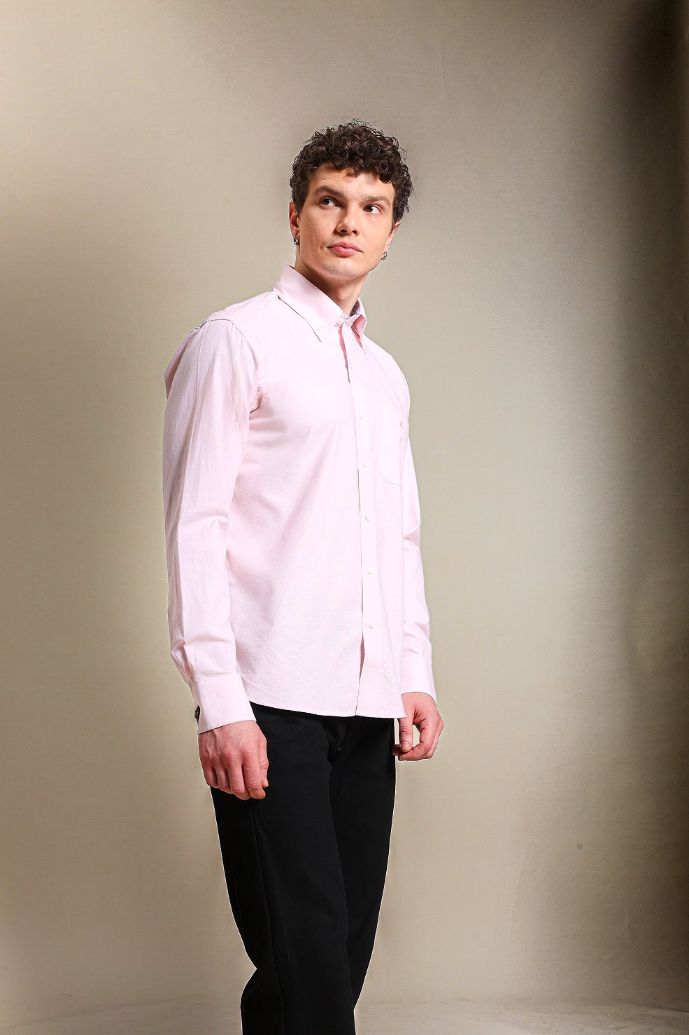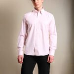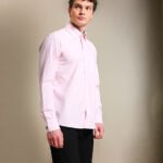 Pink summer shirt with a contrast blue striped collar.
