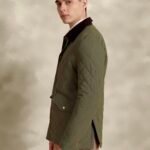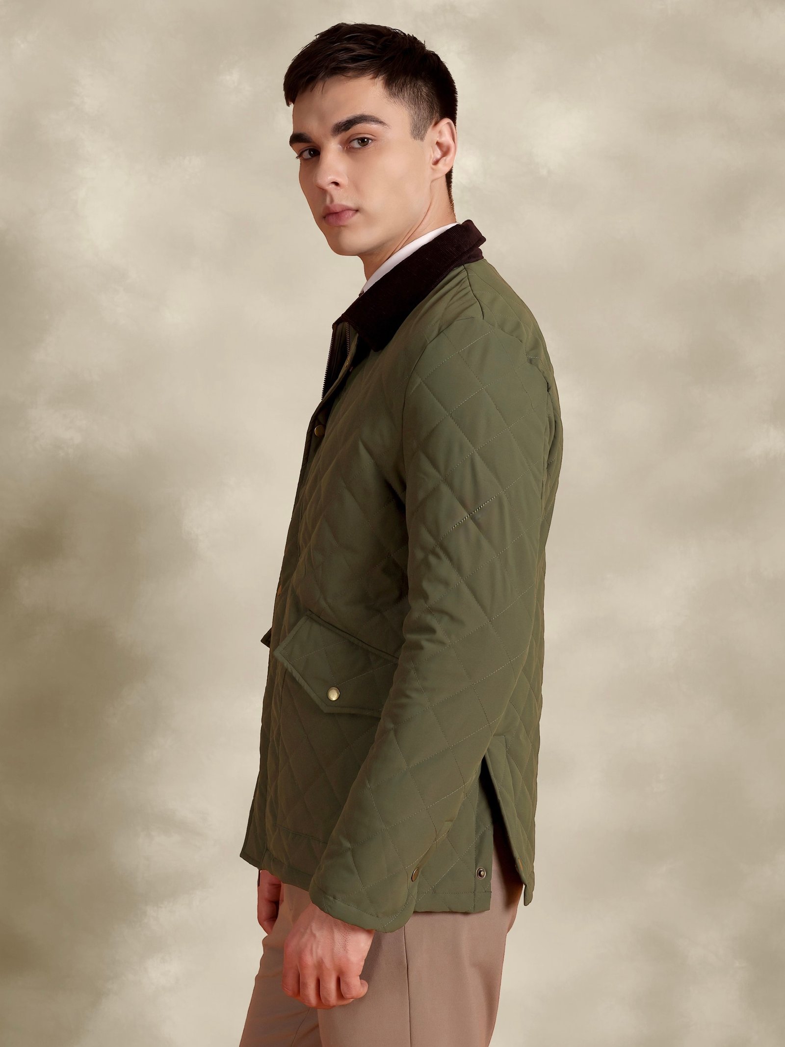 Tagore olive quilted jacket with corduroy collar.