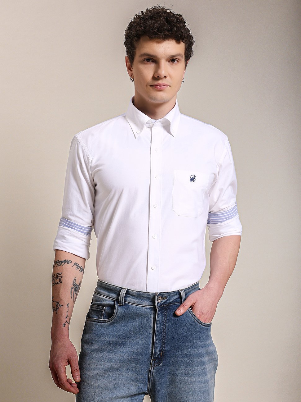 White shirt with sky-blue embroidery.